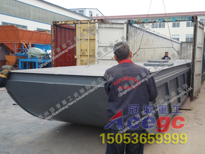 發往加納的淘金船選金設備-承接加納淘金船出口業務,配置全套選金生產線,此為淘金船生產工作現場