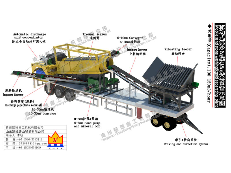 移動式篩沙水洗選金設備移動方便,操作簡單,篩沙、水洗、選金一次完成,加載冠誠重工生產的臥式全自動排礦離心機精選,精選后的精料會由精料管道自動排出;廢料由廢料管道自動排出。